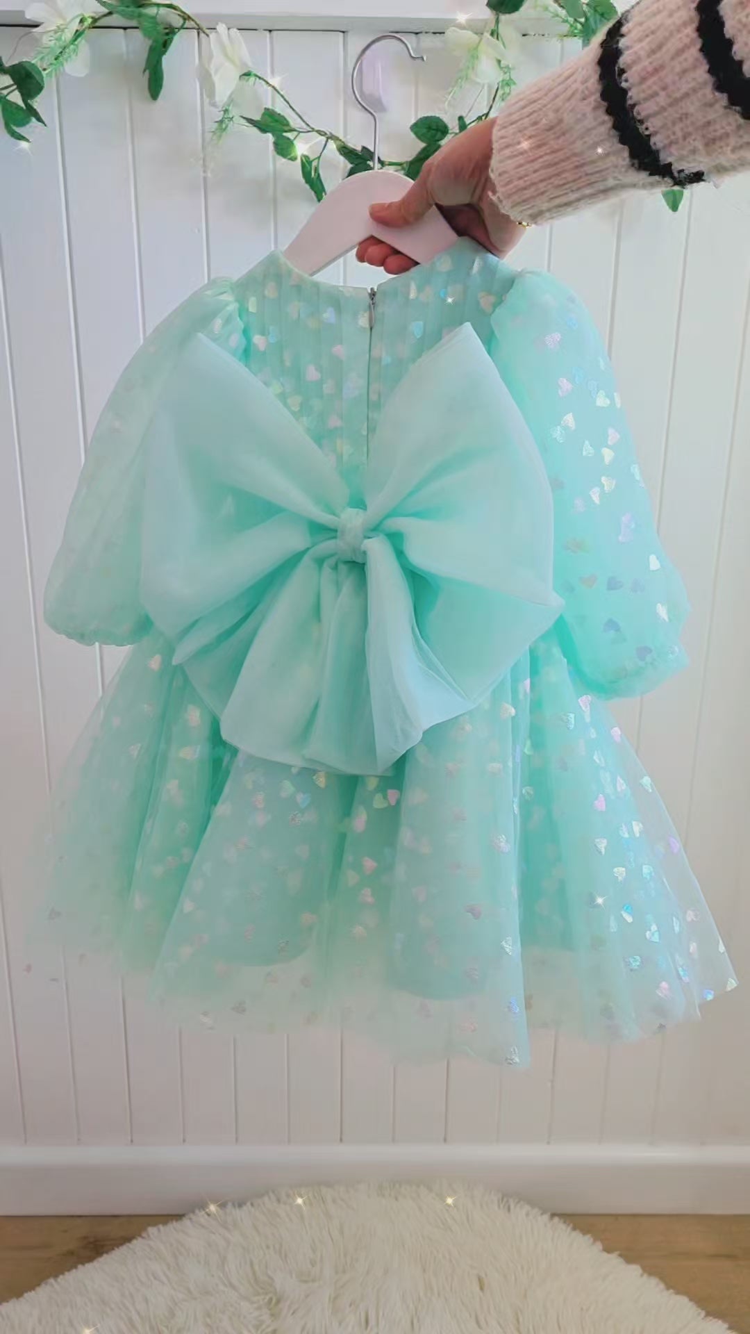 This is a super cute unique puffy long sleeves dress for a baby girl’s first birthday! Choose your favourite colour from these beautiful colour yellow and Green. Made of tulle with colourful heart print. Pleated bodice with stylish detachable butterfly big bow at the back. And inside, it’s super comfy with a soft lining.