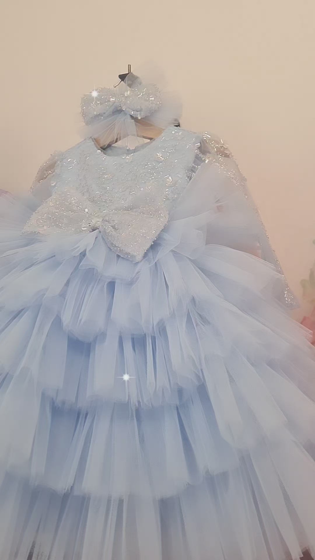 This princess dress for a baby girl’s first birthday designed in Australia. This cupcake dress is made of tulle and beaded fabric. Bodice and long sleeves made of sequins and beaded fabric, Princess Cupcake Skirt designed with multiple layers to make this dress full and fluffy. And inside, it’s super comfy with a soft lining. The matching sparling bow large headpiece is complimentary.